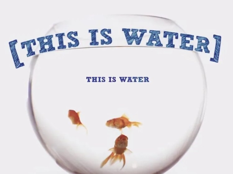 “There are these two young fish swimming along, and they happen to meet an older fish swimming the other way, who nods at them and says, ‘Morning, boys, how’s the water?’ And the two young fish swim on for a bit, and then eventually one of them looks over at the other and goes, ‘What the hell is water?’”