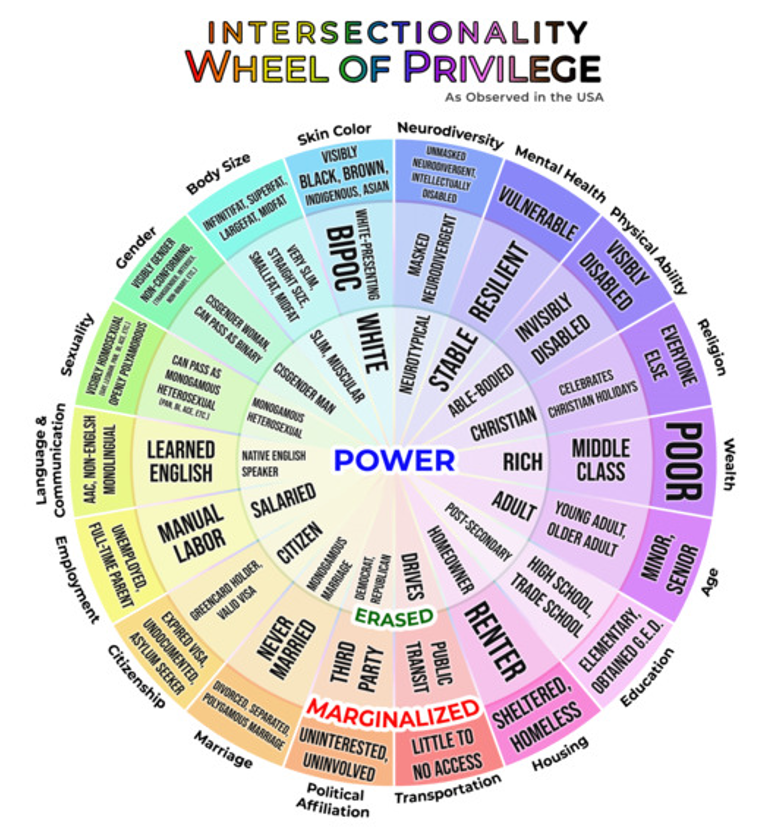 But lately it has occurred to me that this can be applied to any marker of privilege. The wheel below identifies 18 domains of privilege active in Western society: gender, body size, skin colour, neurodiversity, mental health, physical ability, religion, wealth, age, education, housing, transportation, political affiliation, marriage, citizenship, employment, language/communication, and sexuality. And there is probably scope to add a few more!