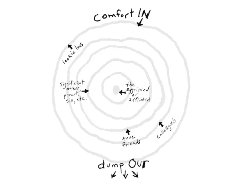 The model proposes that true allies offer support to those who occupy a circle nearer to the person at the centre than they themselves do. Venting or trauma-dumping can only be directed to those who occupy a ring further away.